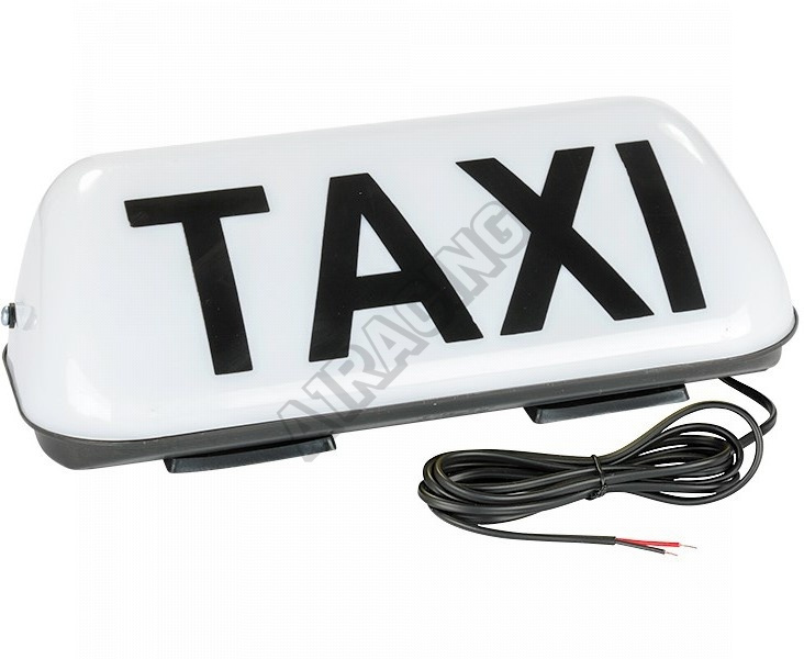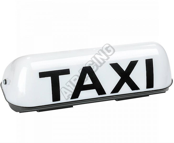 Lampa v bílém pouzdře s nápisem TAXI na obou stranách