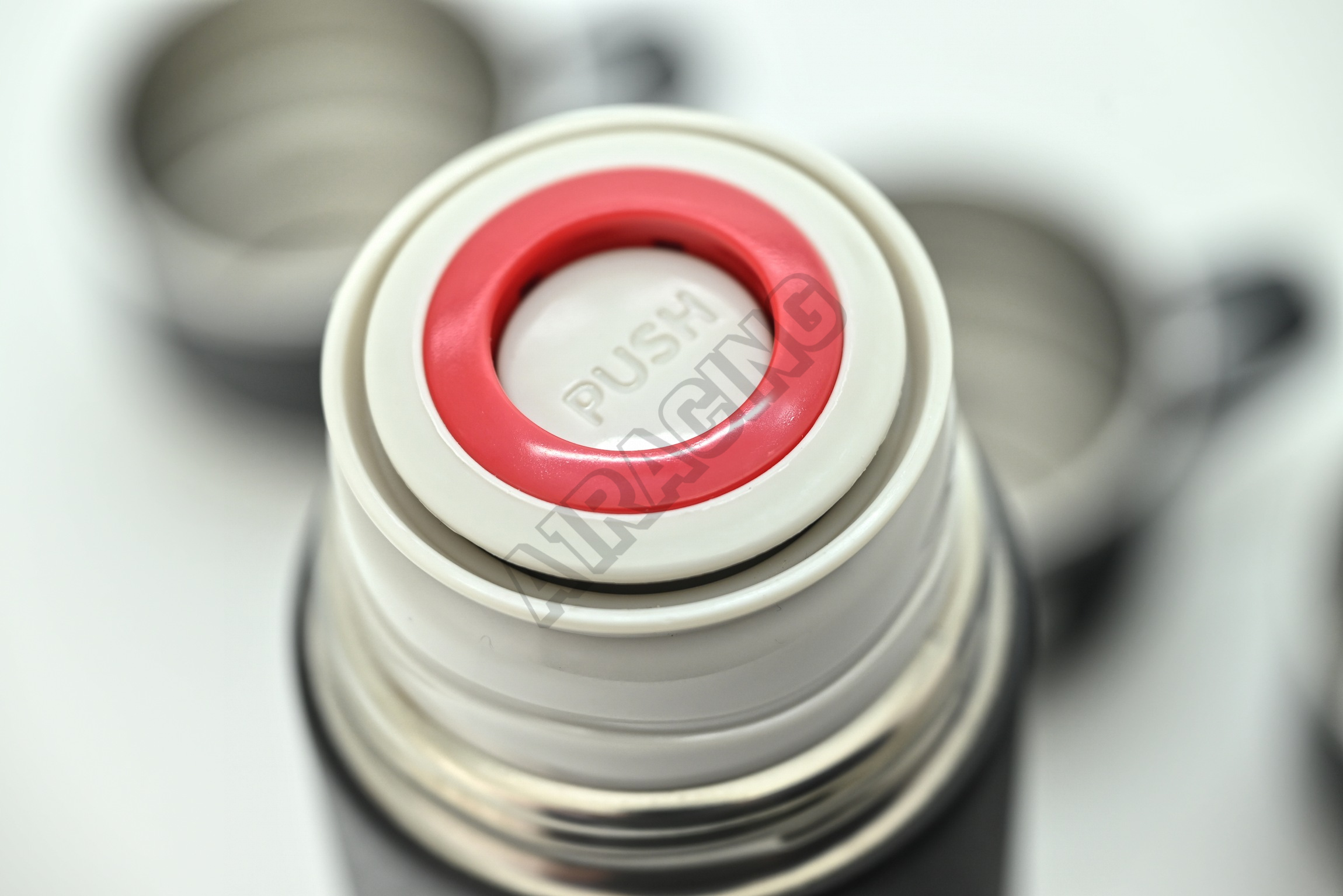 Vrchní část termosky je opatřena těsnícím víčkem s tlačítkem pro snadné nalévání, víčko lze navíc zakrýt jedním ze šálků.