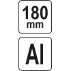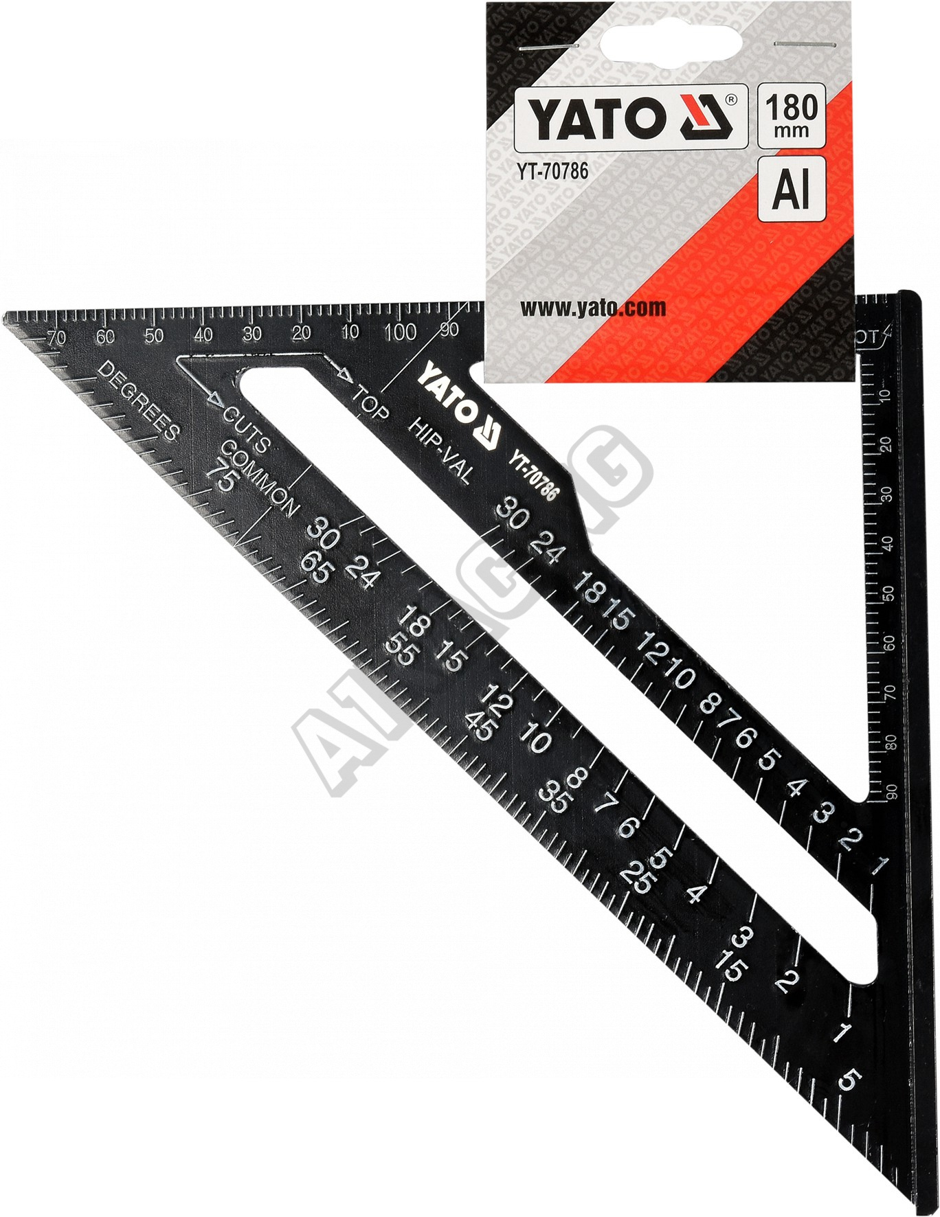 Tesařský hliníkový trojúhelník 180 mm s patkou. Je vyroben z hliníkové slitiny s lakovaným povrchem, trvale nanesená milimetrová i palcová stupnice a specializované úhlové stupnice určené pro měření prováděná při tesařských a pokrývačských pracích.