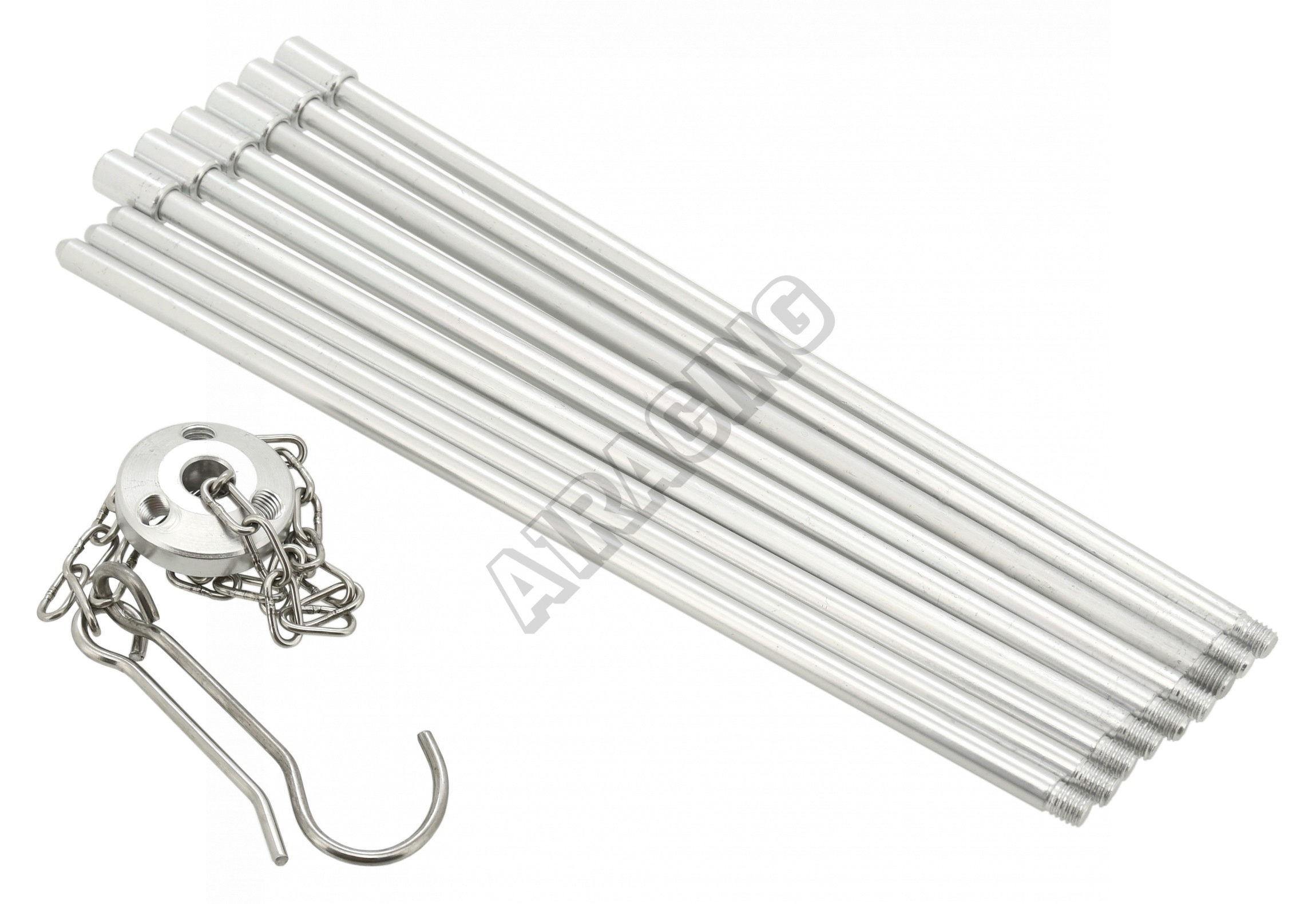 Výtečný pomocník pro zavěšení zátěže do 15 kg (kotlíků, konvic, apod.) nad ohněm. Závěs je opatřen řetízkem a zakončením, kterým je možné regulovat výšku samotného háku.
