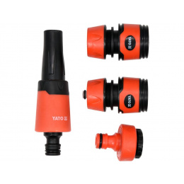 Tryska postřikovací a zavlažovací v sadě se 3 koncovkami. 2x hadicová rychlospojka, 1x šroubovací spojka s vnitřním závitem 1/2" (12,7 mm) nebo 3/4" (19 mm). Vyrobeno z kvalitního ABS plastu