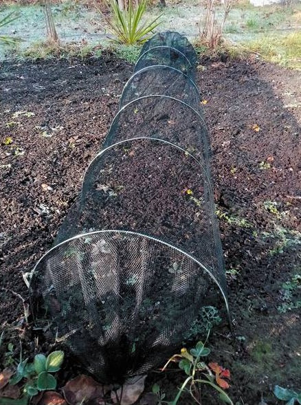Ochranný tunel pro rostliny z černé polyesterové síťoviny.
