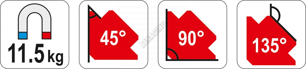Umožňuje přesné spojování materiálů v úhlech 45°, 90° a 135°. Nosnost magnetu cca 11,5 kg. Povrchová úprava červené práškové lakování.