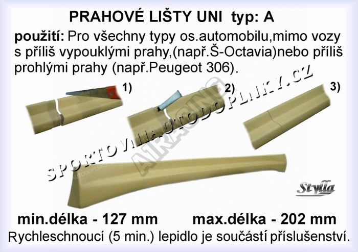 - universální použití, nehodí se jen pro auta s více vypouklými prahy jako je třeba Škoda Octavia nebo hodně prohlými prahy jako u Peugeotu 306, instalace délky se provádí rozříznutím prahů ve střední části, kde překlenutím pres sebe docílíte vaši požadovane délky tak jak je na obrázku, pred samotným lakováním nebude problém pro lakyrníka hranu překrýt tmelem