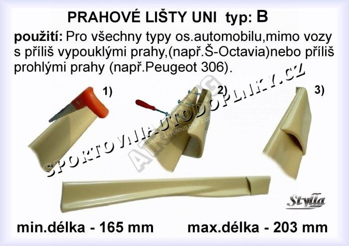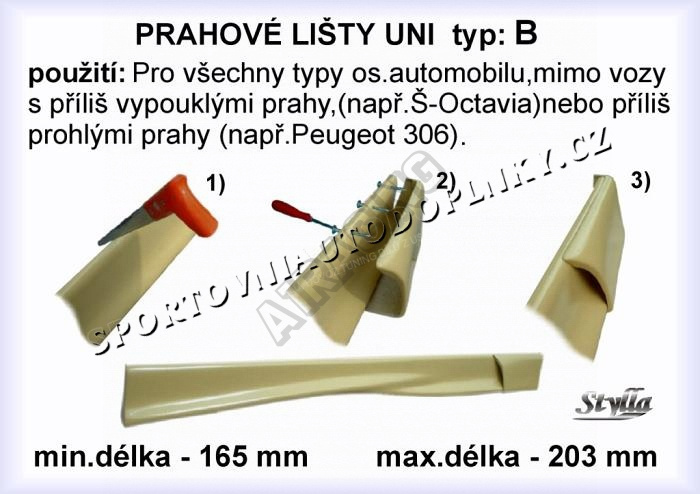 - universální použití, nehodí se jen pro auta s více vypouklými prahy jako je třeba Škoda Octavia nebo hodně prohlými prahy jako u Peugeotu 306, instalace délky se provádí rozříznutím prahů ve střední části, kde překlenutím pres sebe docílíte vaši požadovane délky tak jak je na obrázku, pred samotným lakováním nebude problém pro lakyrníka hranu překrýt tmelem