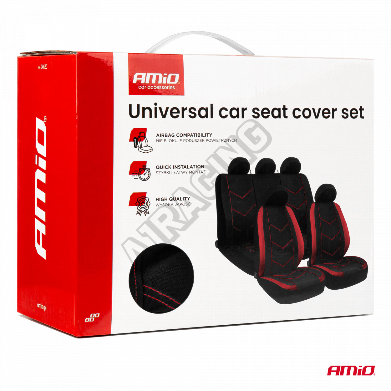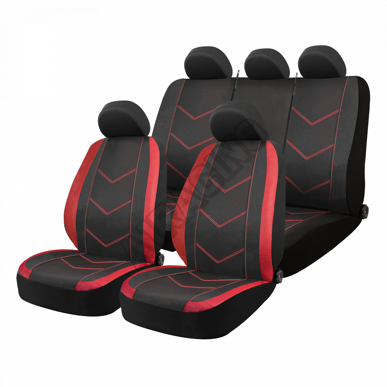 Sada 9 dílů zahrnuje potahy na dvě přední sedadla, dělenou zadní lavici a sadu opěrek hlavy. Univerzální přizpůsobení pro většinu modelů osobních automobilů.