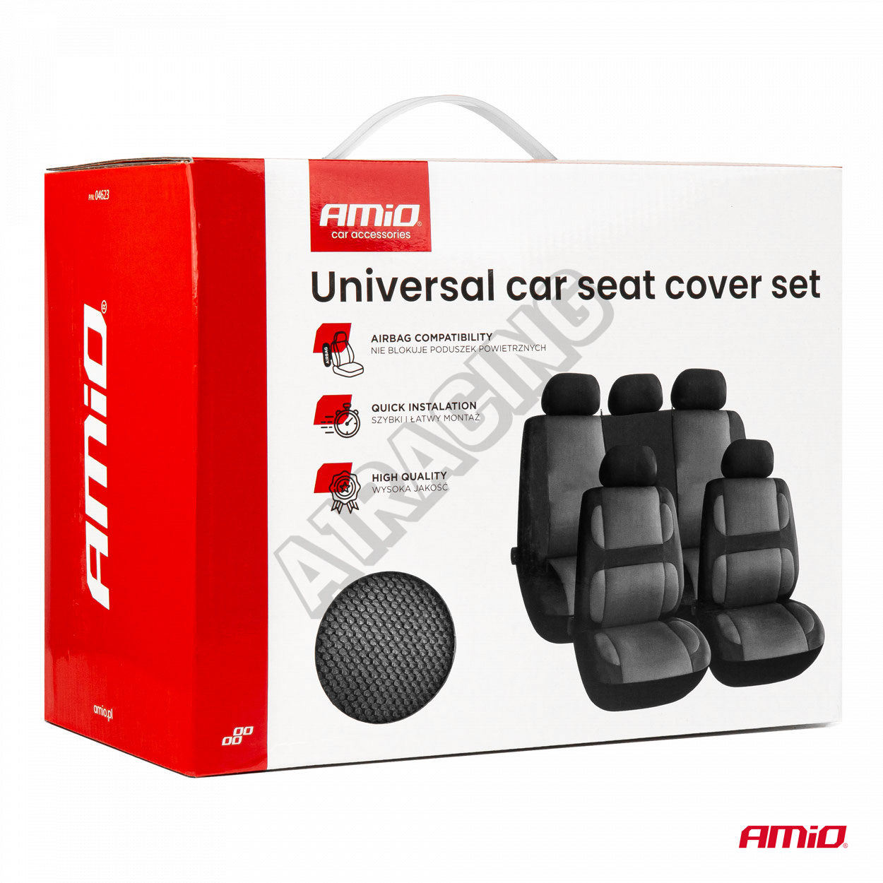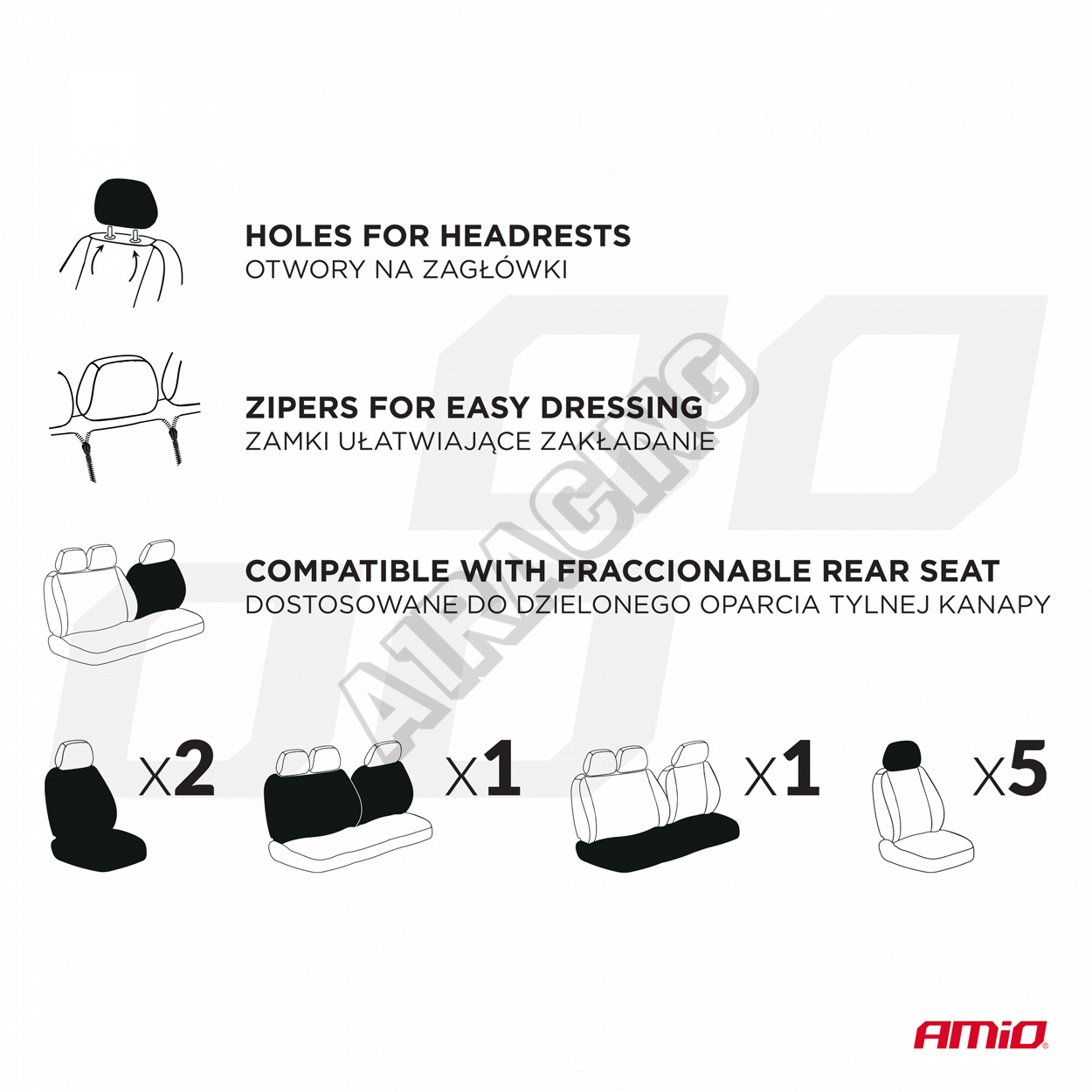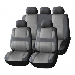 Sada 9 kusů zahrnuje potahy na dvě přední sedadla, dělenou zadní lavici a sadu opěrek hlavy. Univerzální přizpůsobení pro většinu modelů osobních automobilů.
