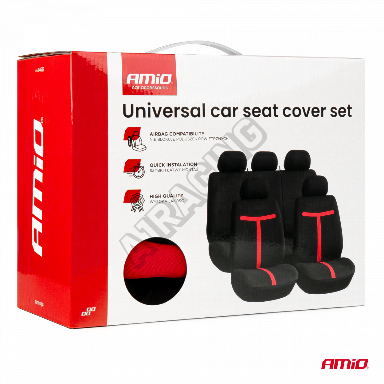 Sada 9 kusů zahrnuje potahy na dvě přední sedadla, dělenou zadní lavici a sadu opěrek hlavy. Univerzální přizpůsobení pro většinu modelů osobních automobilů.