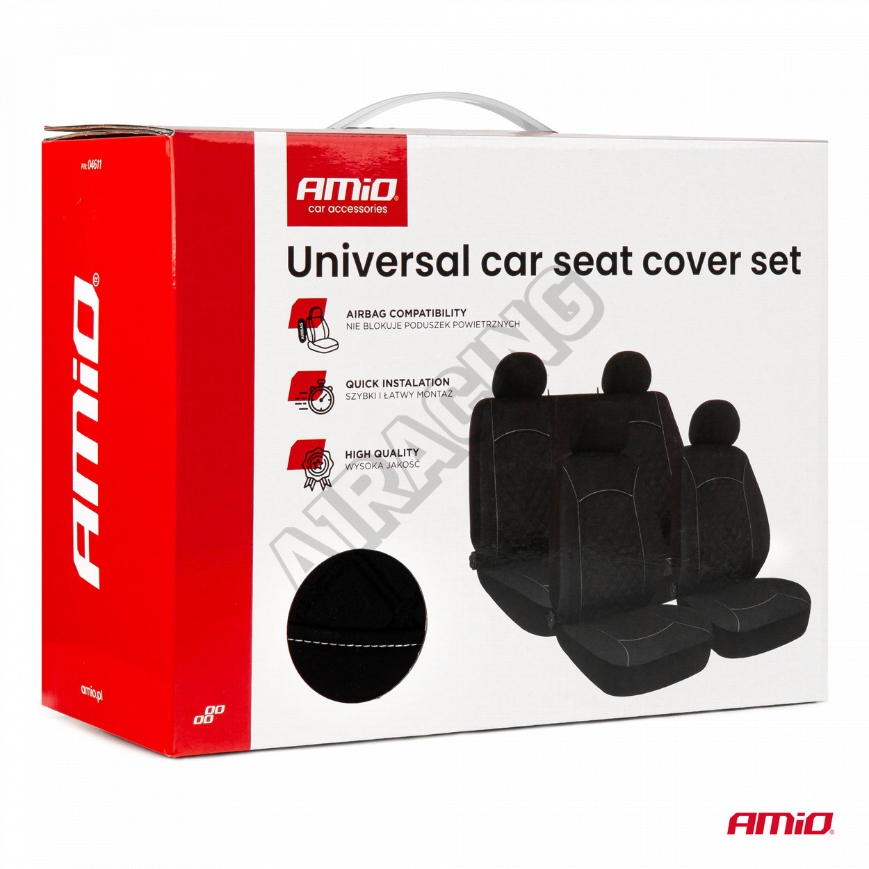 Sada 9 kusů zahrnuje potahy na dvě přední sedadla, dělenou zadní lavici a sadu opěrek hlavy. Univerzální přizpůsobení pro většinu modelů osobních automobilů.