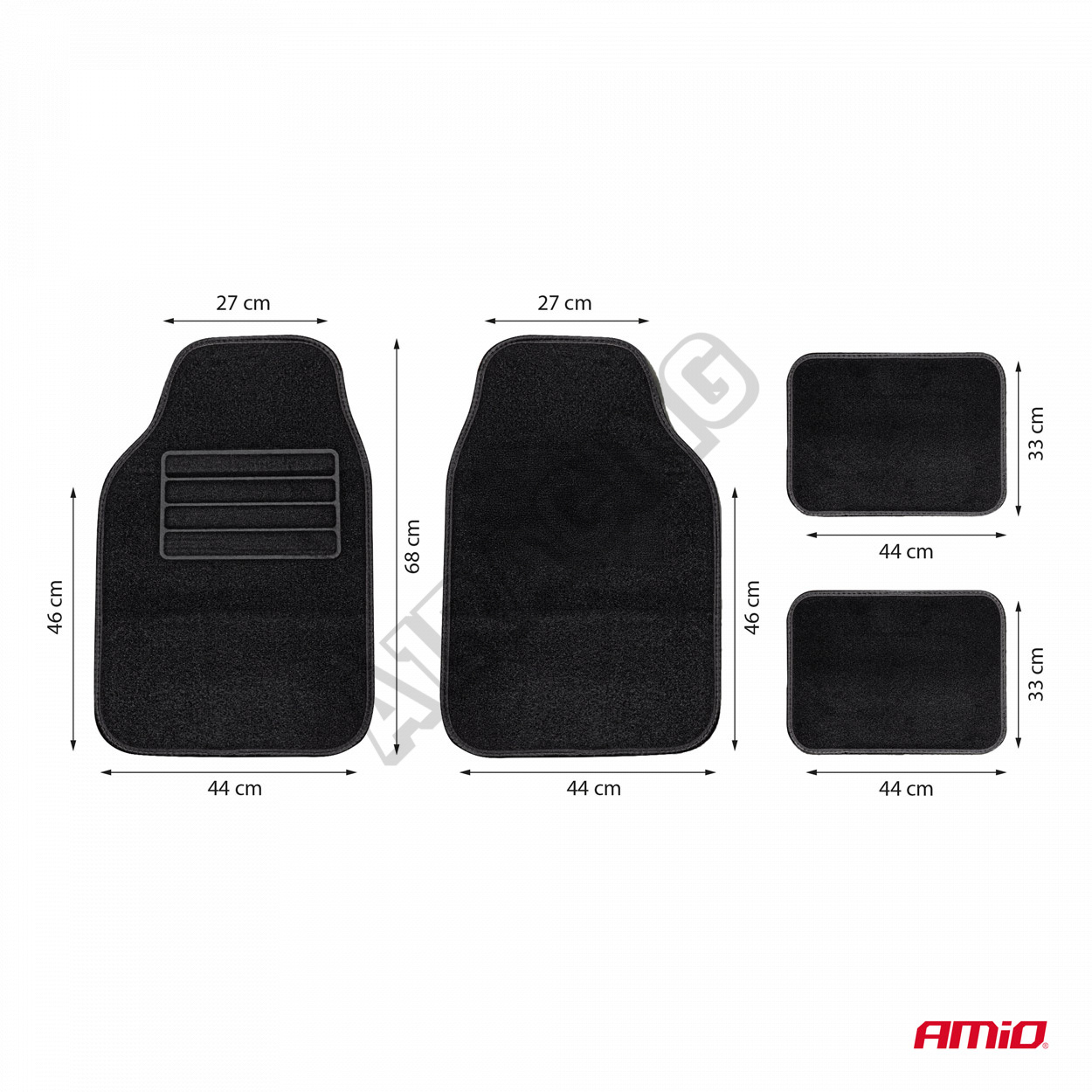 Univerzální sada textilních koberečků TCM-04 je praktickým řešením pro širokou škálu modelů osobních automobilů. Vyrobené z odolného materiálu, odolného proti oděru a snadno čistitelného, zajišťují estetický vzhled interiéru a účinnou ochranu podlahy vozidla.