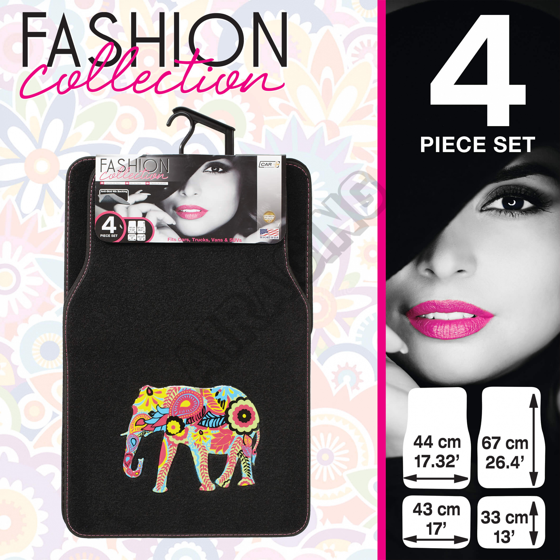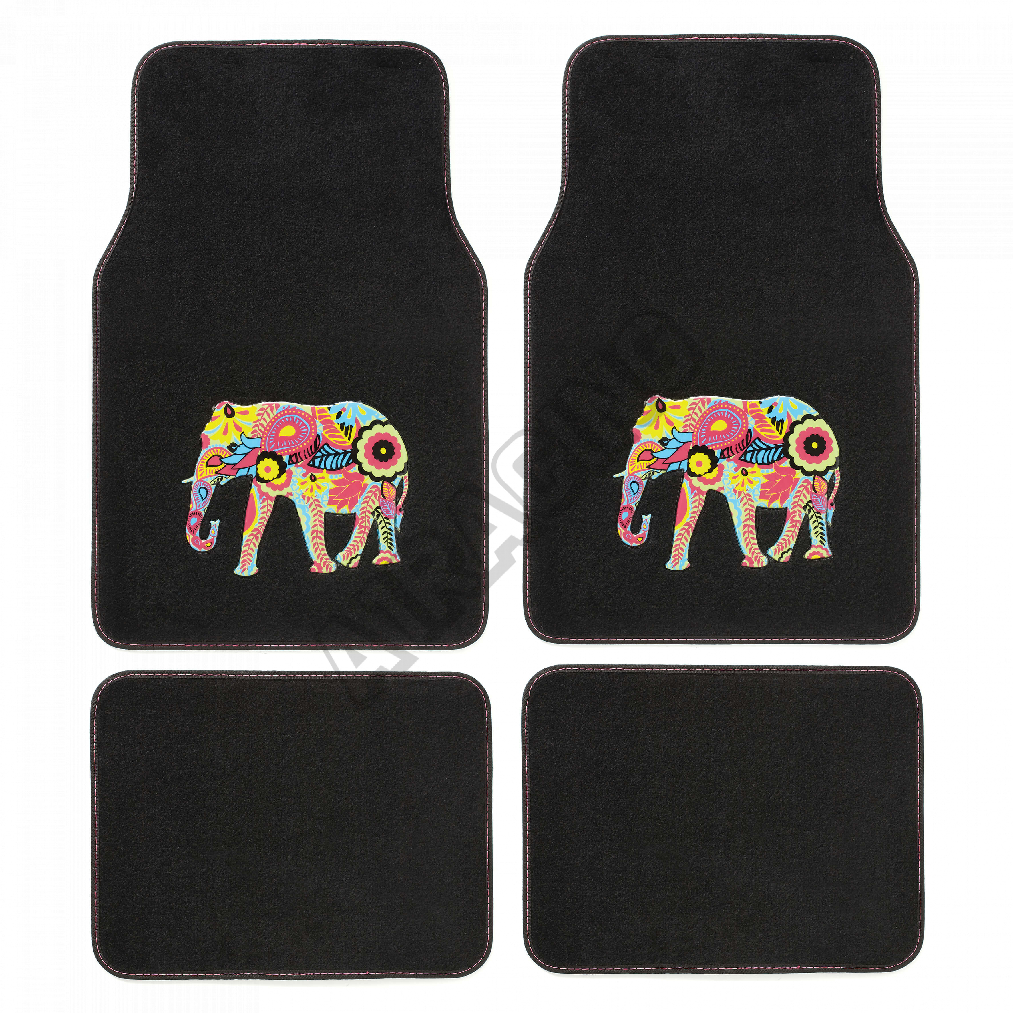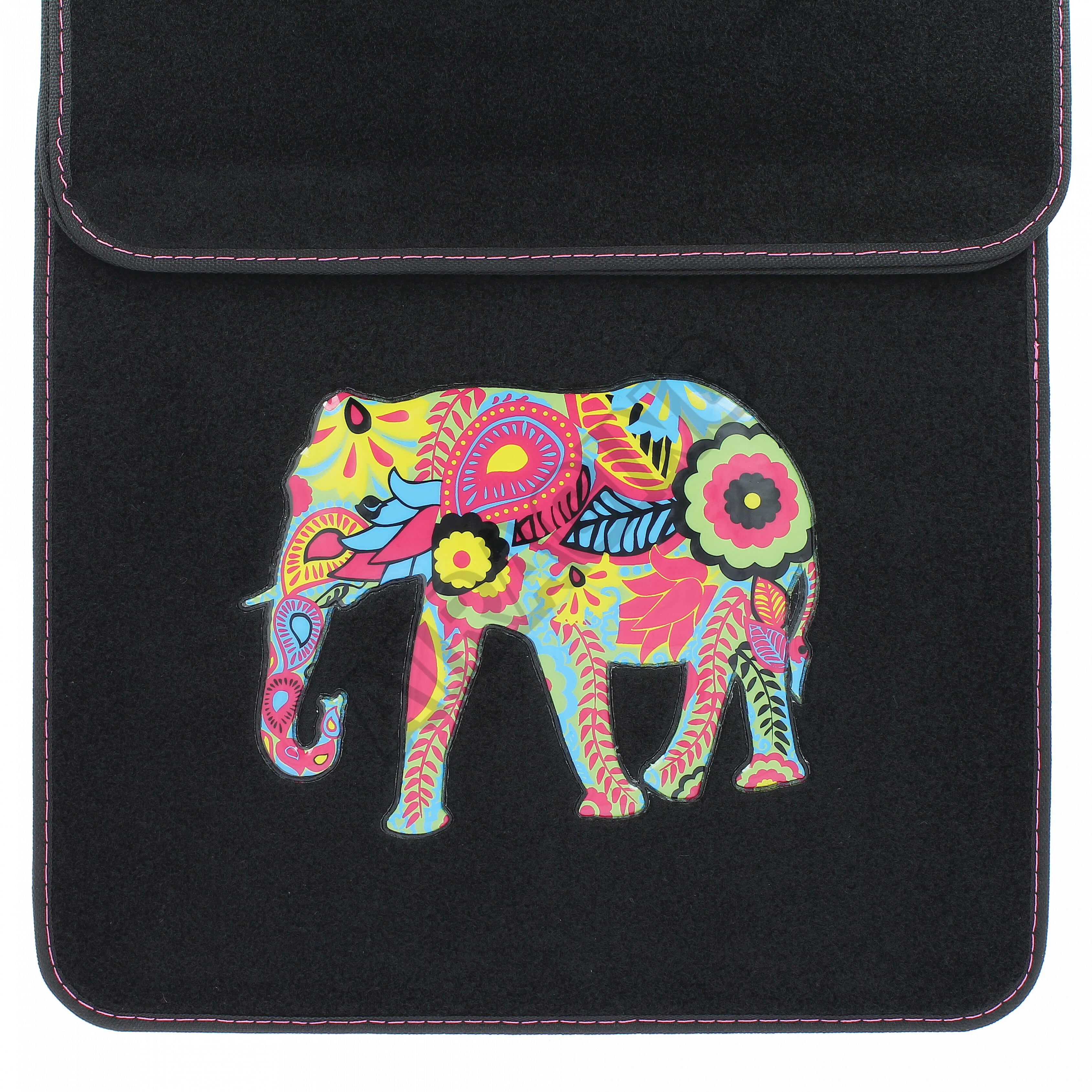 Kvalitní sada černých textilních autokoberců s motivem barevného slona. Rozměry koberců jsou uvedeny na hlavní fotce. Kompletní sada 4 ks. Spodní část je s jemnýmy výstupky, aby bránily posuvu autokoberce v interiéru auta.