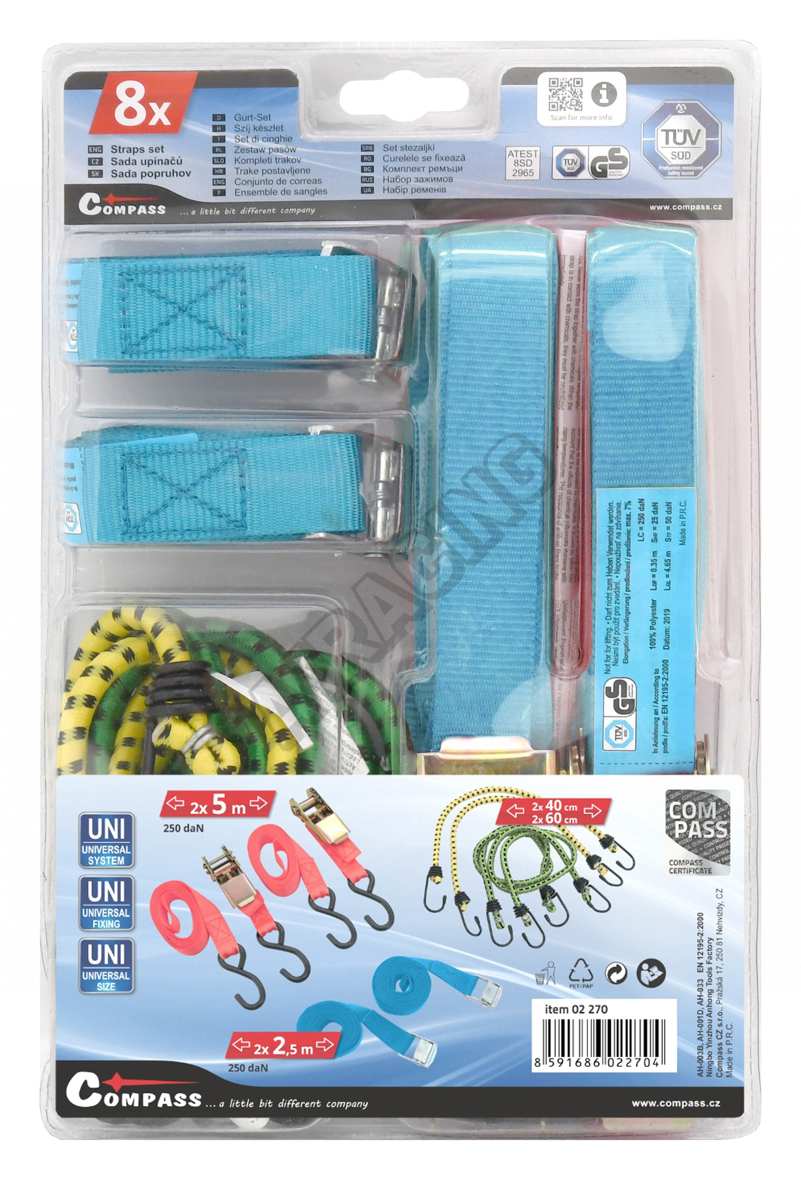 Univerzální sada upínacích popruhů a pružných upínačů s homologací TÜV/GS, k zajištění předmětů, zav