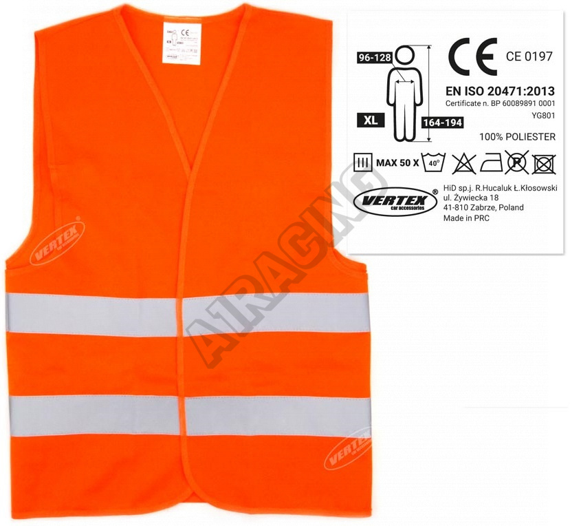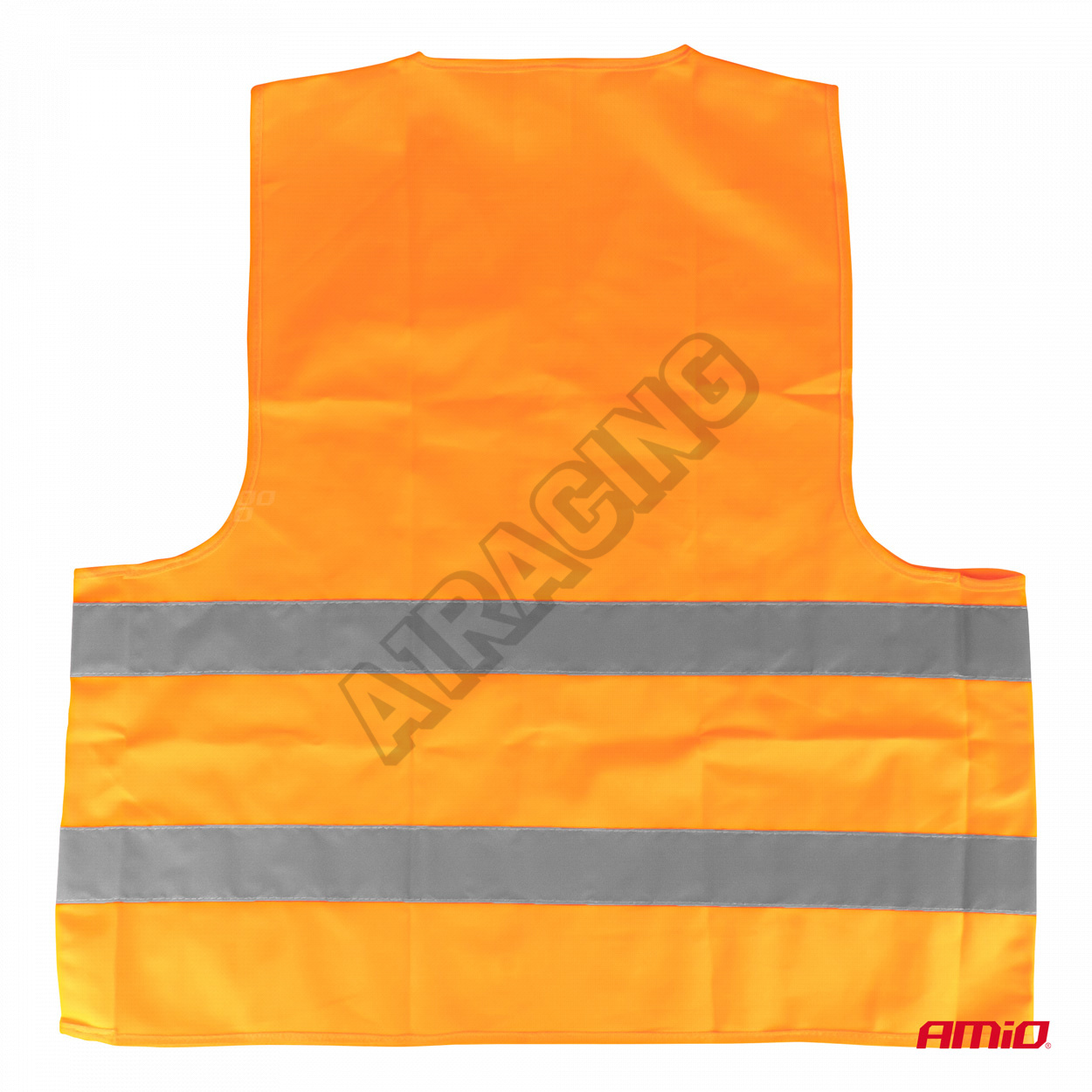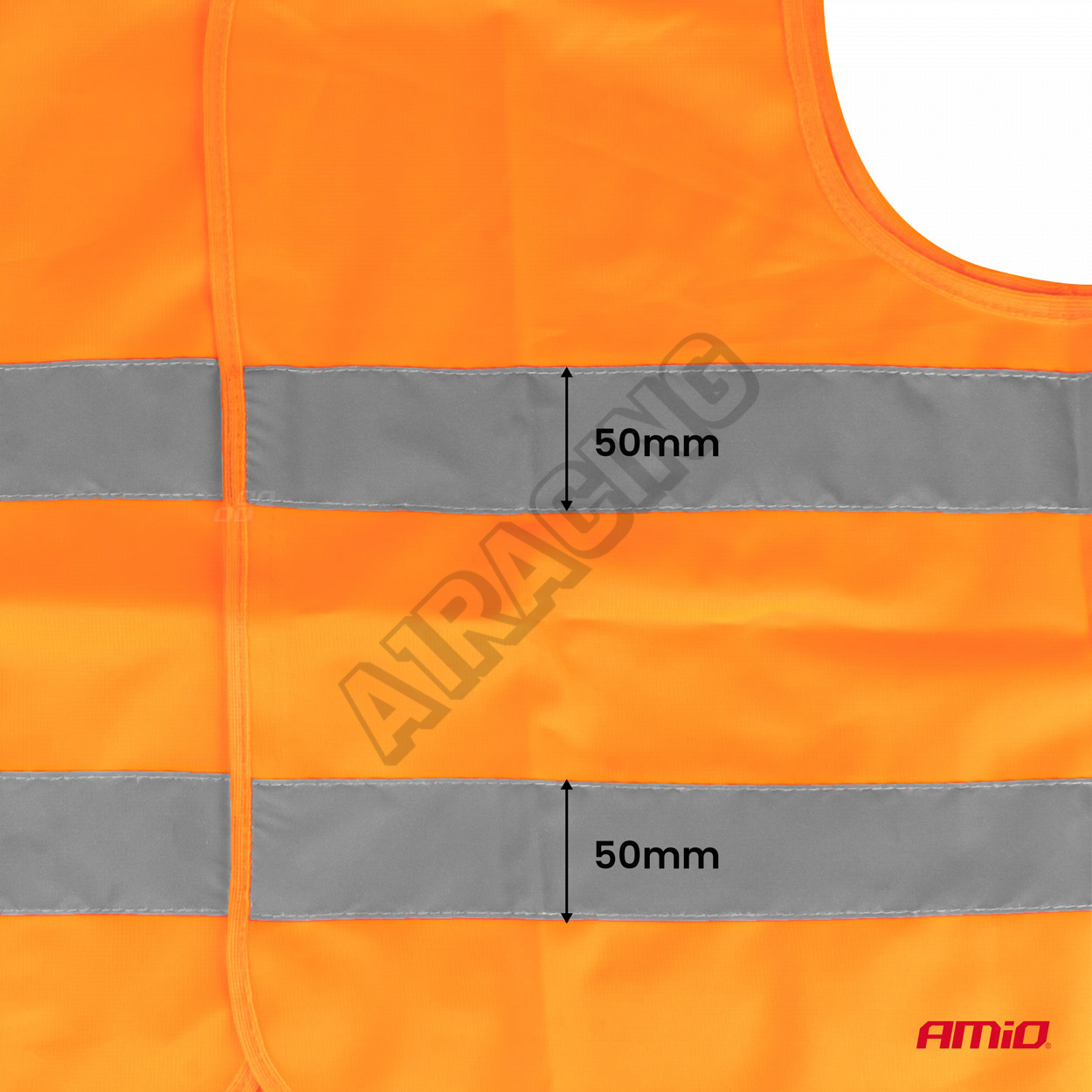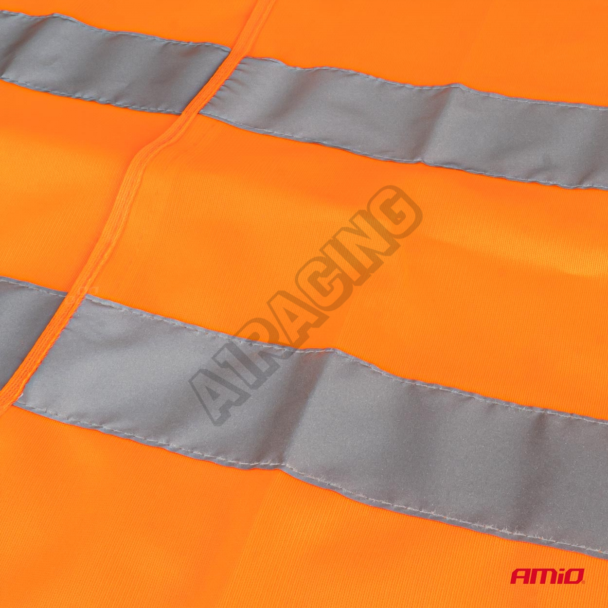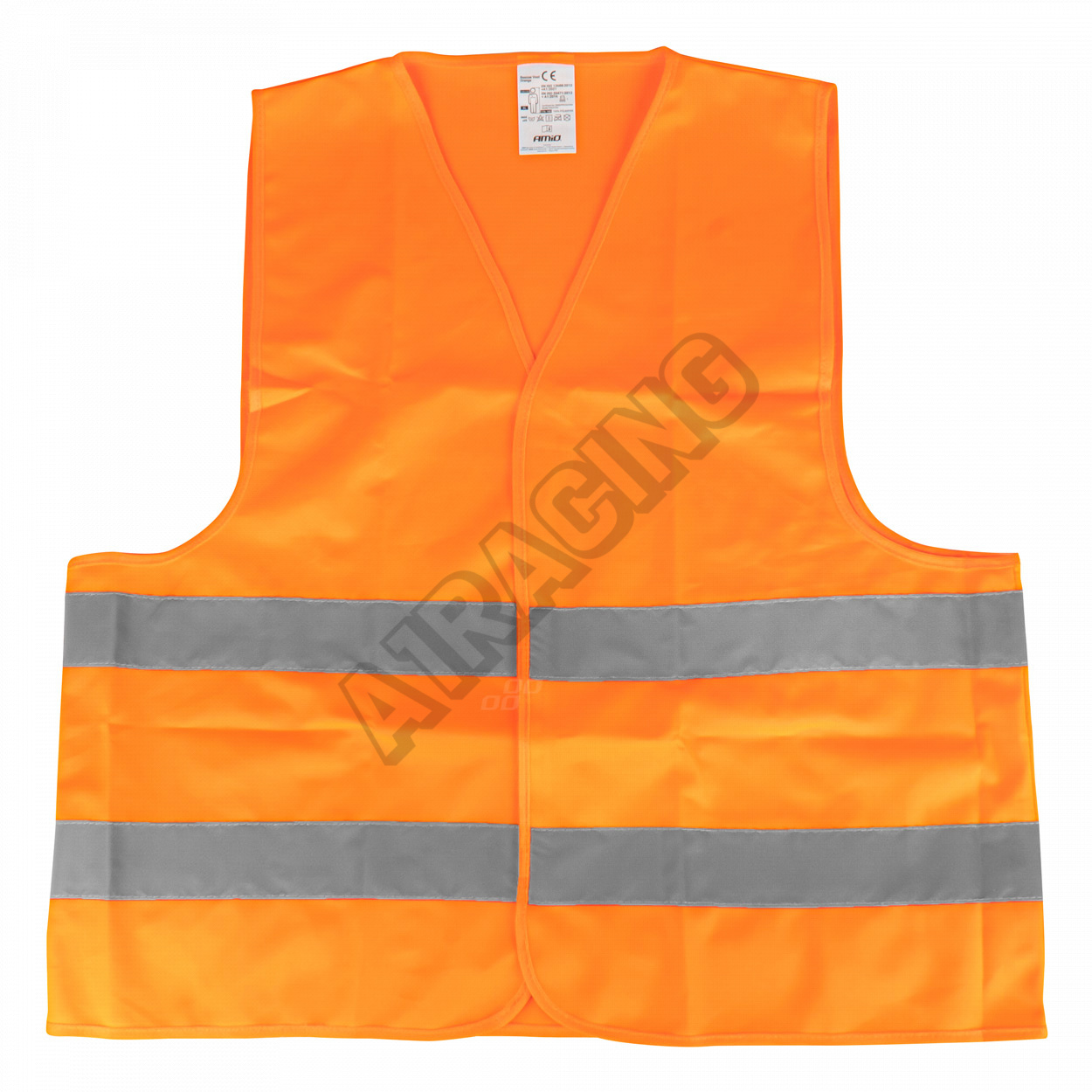 Výstražná reflexní vesta se zapínáním na suchý zip. Dva stříbrné reflexní pruhy po celém obvodu, oranžová barva.