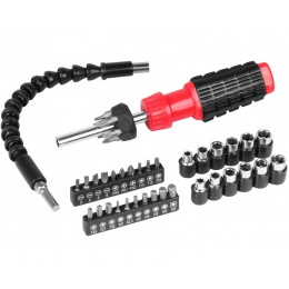 Součástí balení jsou sada bitů, nástavců pro křížový a plochý šroubovák + pružné prodloužení pro změnu úhlu šroubování.