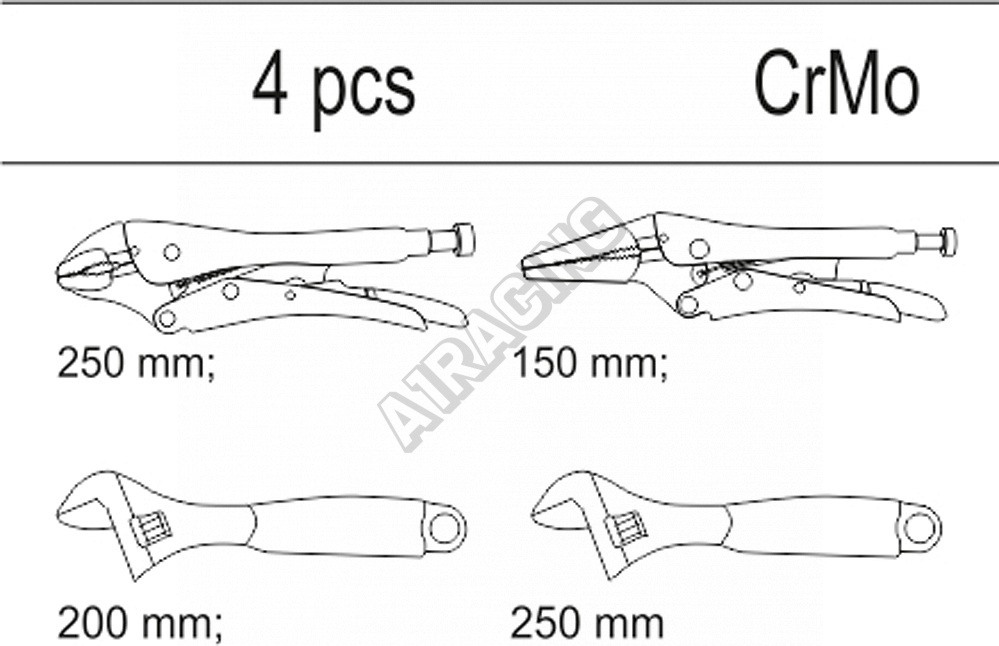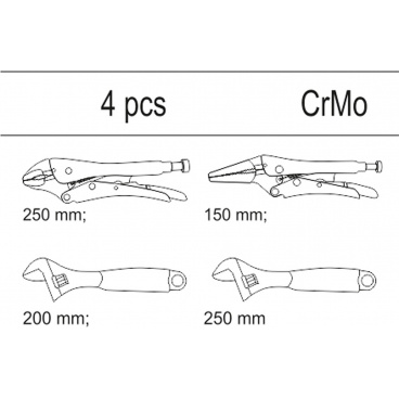 Sada 4 kusů kleští a klíčů z CrV oceli. Sada je přehledně srovnána ve vložce do zásuvky z PVC.