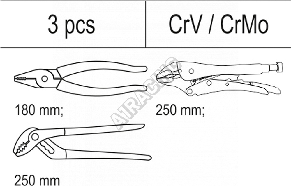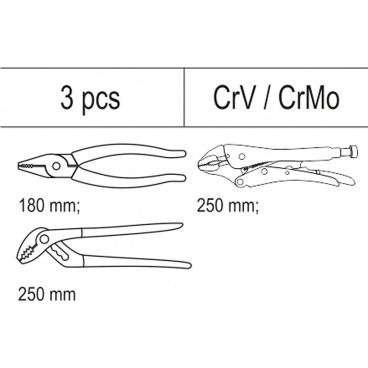 Obsah balení: - Kleště: siko 250 mm; kombinované 180 mm; samosvorné 250 mm