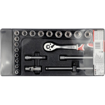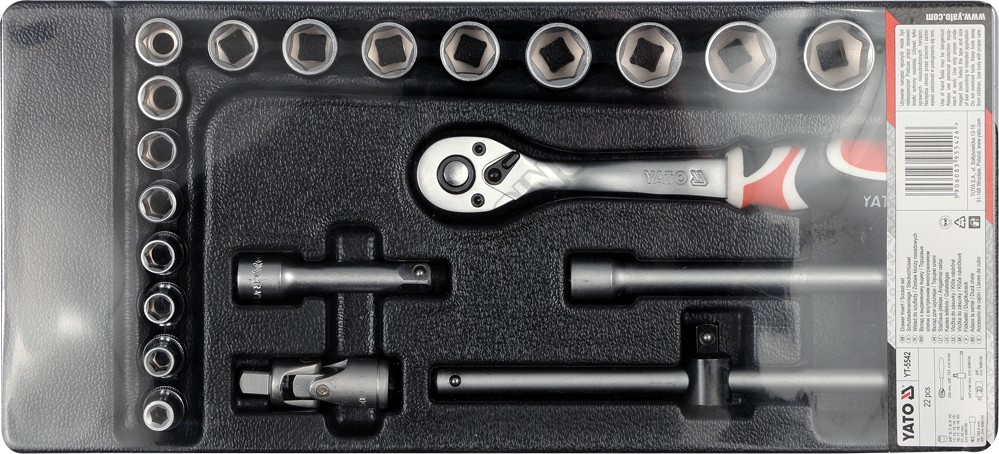 Sada 22 kusů ořechů a ráčny z CrV oceli. Gola sada je přehledně srovnána ve vložce do zásuvky z PVC.