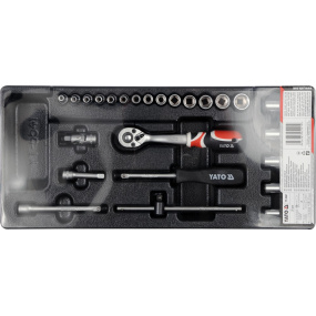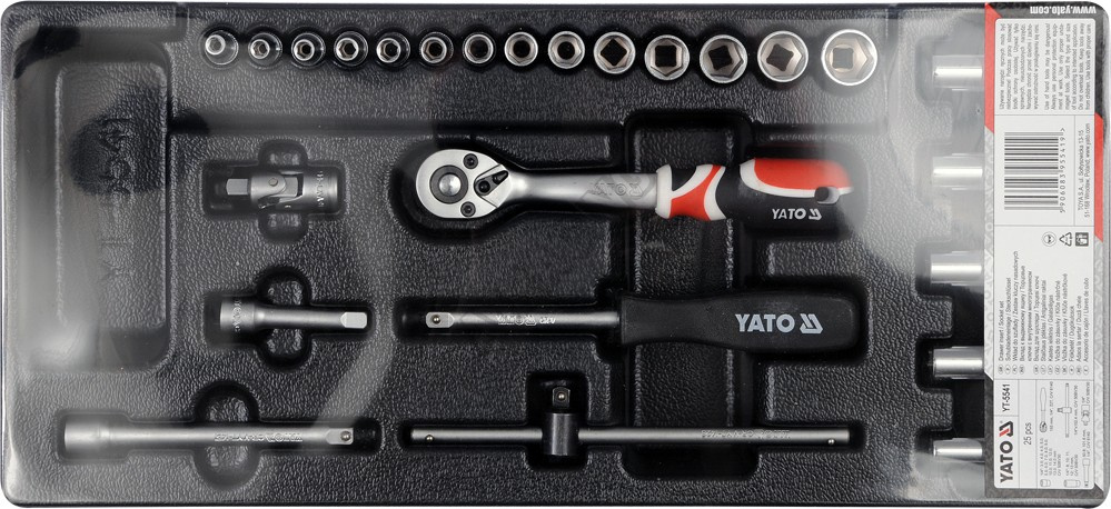 Sada 25 kusů ořechů a ráčny z CrV oceli. Gola sada je přehledně srovnána ve vložce do zásuvky z PVC.