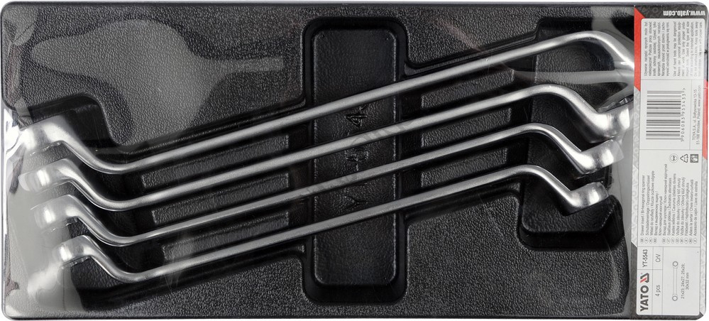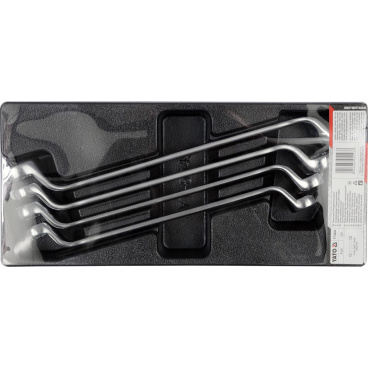 Sada 4 kusů očkových ohnutých klíčů z CrV oceli. Sada je přehledně srovnána ve vložce do zásuvky z PVC.