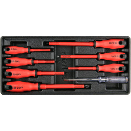 Sada 8 kusů elektrikářských šroubováků z oceli s izolací. Sada je přehledně srovnána ve vložce do zásuvky z PVC.