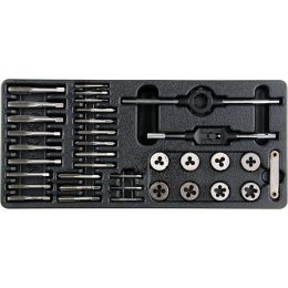Sada 35 kusů závitníků z HSS oceli. Sada je přehledně srovnána ve vložce do zásuvky z PVC.