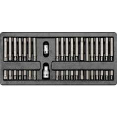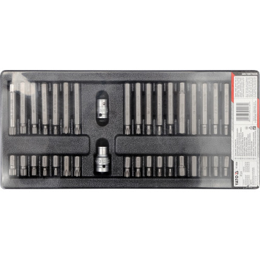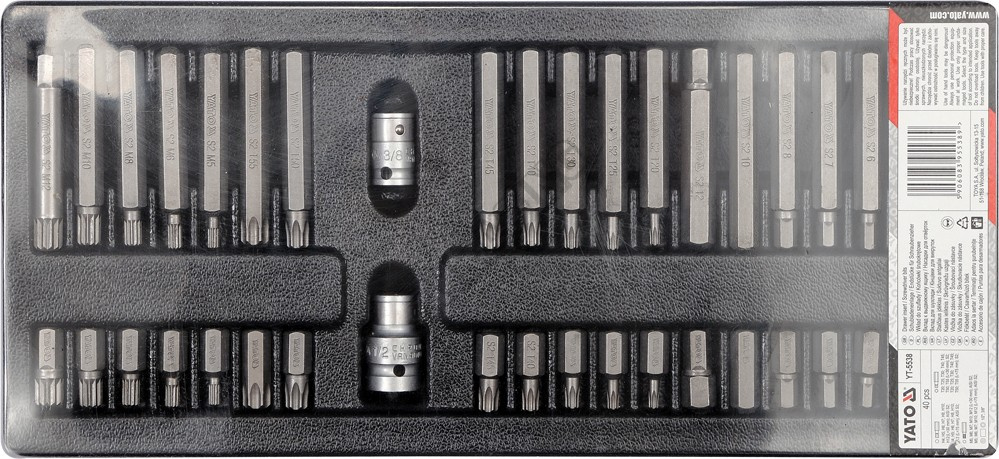 Sada 40 kusů bitů z CrV oceli. Sada bitů je přehledně srovnána ve vložce do zásuvky z PVC.Technická