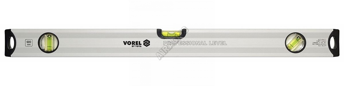 Vodováha vyrobená z eloxovaného hliníkového profilu. Má tři lahvičky pro označení svislého, vodorovn