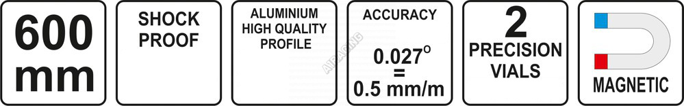 Precizní hliníková vodováha s magnetickými vlastnostmi, s přesností 0,027° (0,5mm/m).