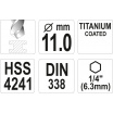 Vyrobeno z rychlořezné HSS oceli s Titanovým povlakem a vrcholovým úhlem 135°. Vrták je opatřen HEX 1/4" uchycením.