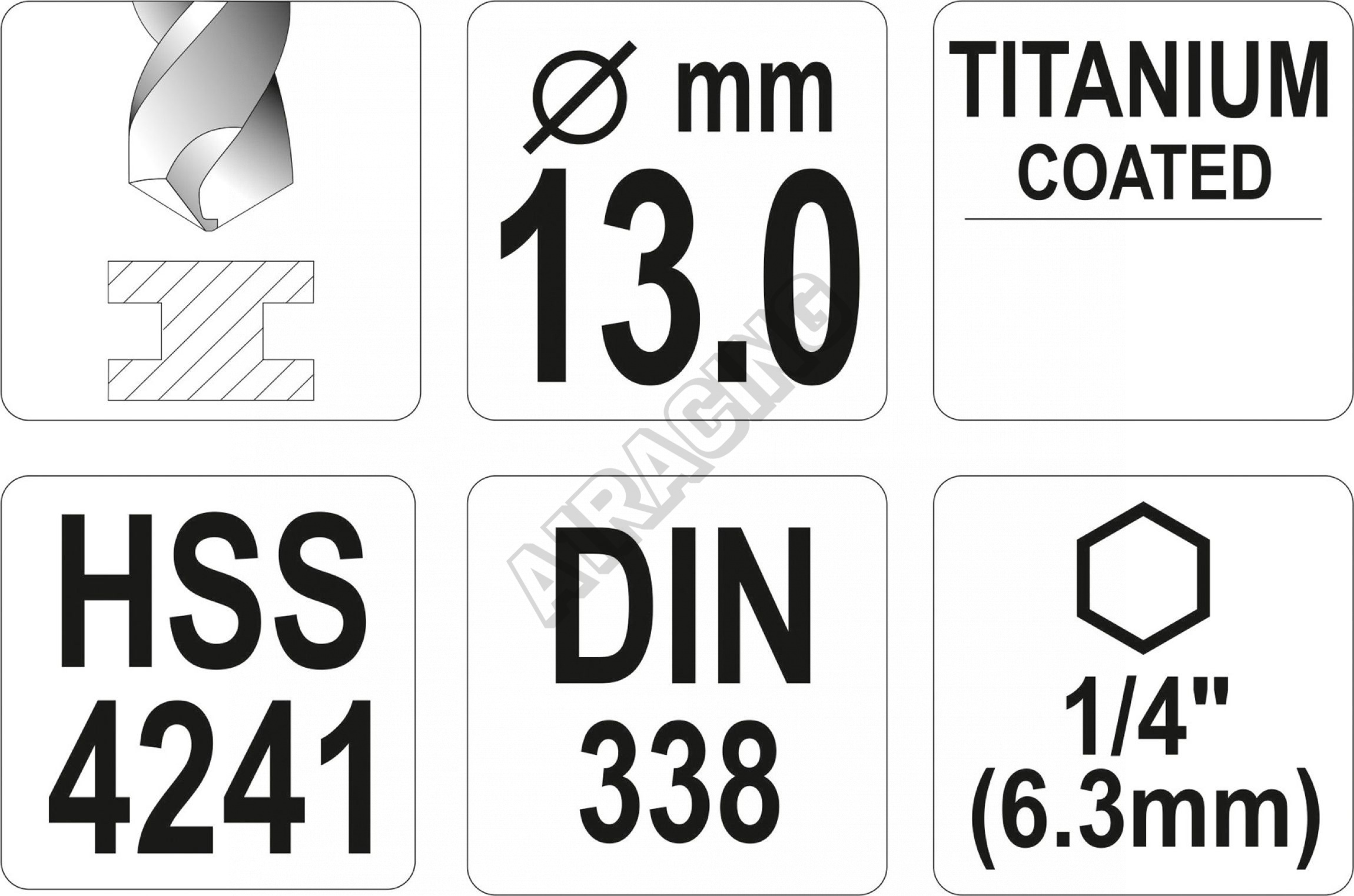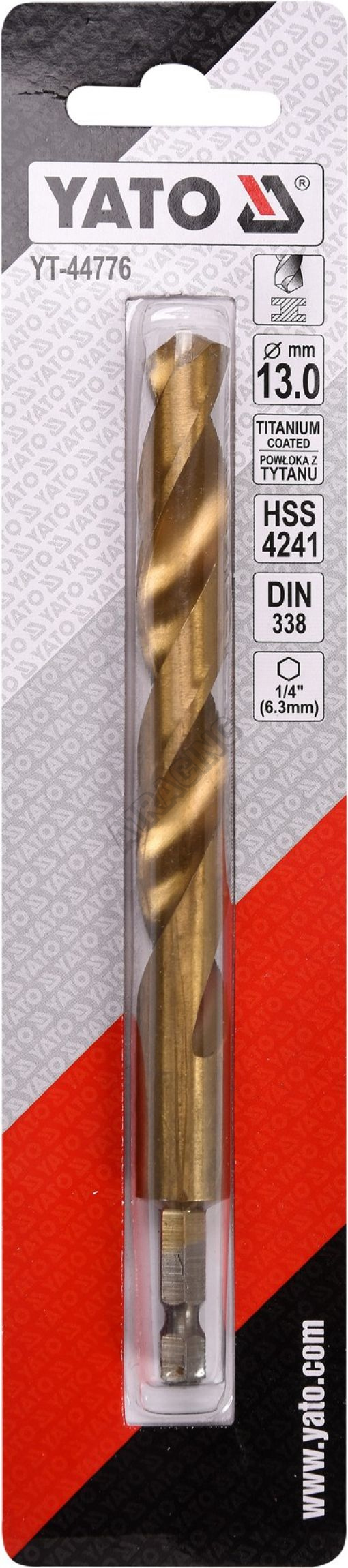 Vyrobeno z rychlořezné HSS oceli s Titanovým povlakem a vrcholovým úhlem 135°. Vrták je opatřen HEX 1/4" uchycením.