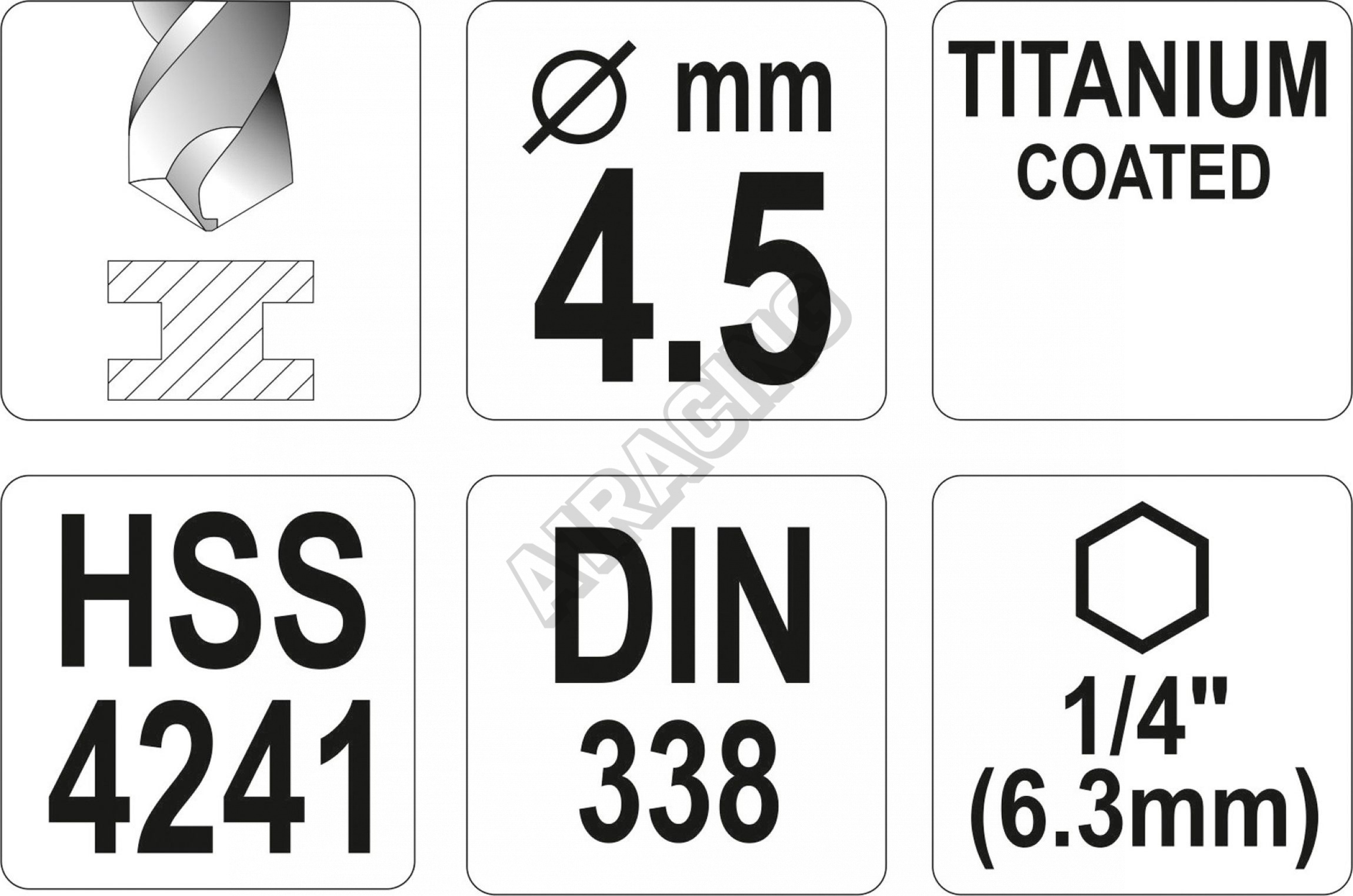 Vyrobeno z rychlořezné HSS oceli s Titanovým povlakem a vrcholovým úhlem 135°. Vrták je opatřen HEX 1/4" uchycením.