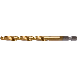 Vyrobeno z rychlořezné HSS oceli s Titanovým povlakem a vrcholovým úhlem 135°. Vrták je opatřen HEX 1/4" uchycením.