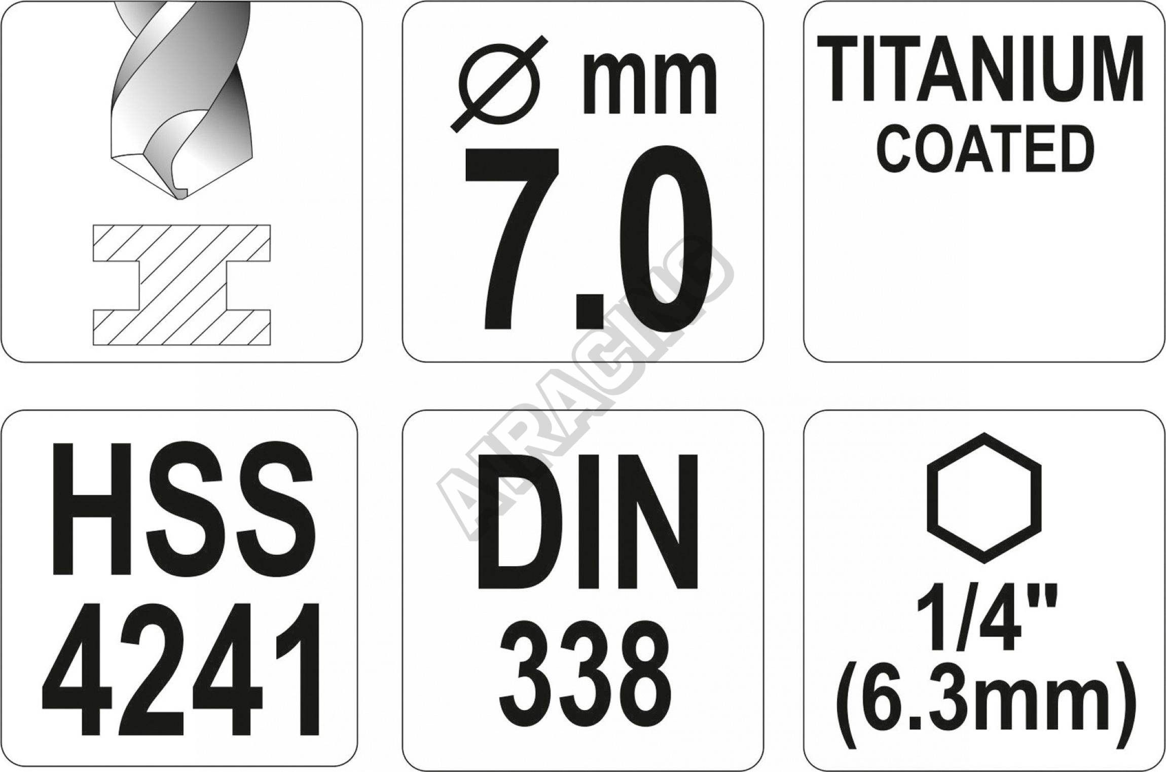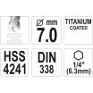 Vyrobeno z rychlořezné HSS oceli s Titanovým povlakem a vrcholovým úhlem 135°. Vrták je opatřen HEX 1/4" uchycením.