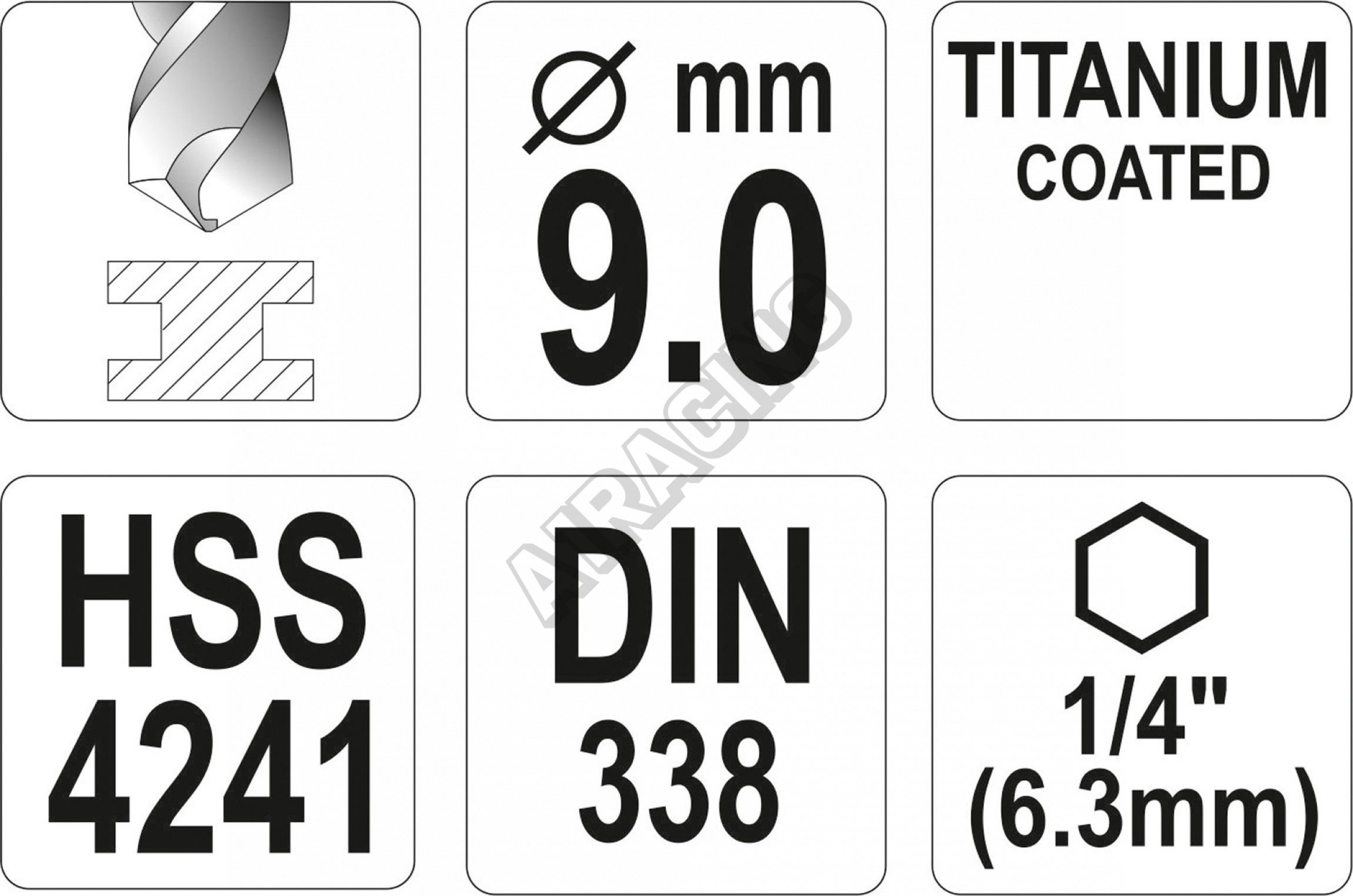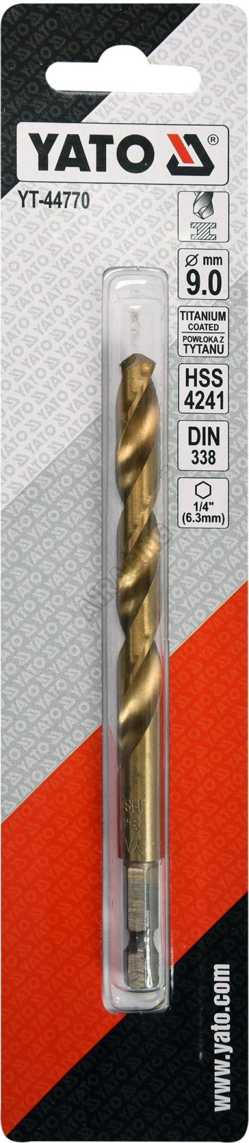 Vyrobeno z rychlořezné HSS oceli s Titanovým povlakem a vrcholovým úhlem 135°. Vrták je opatřen HEX 1/4" uchycením.
