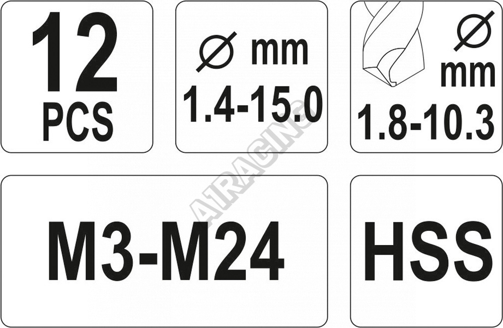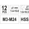 Sada obsahuje 6 kusů vrtáků a 6 kusů levotočivých vytahovačů pro závity M3 - M24.