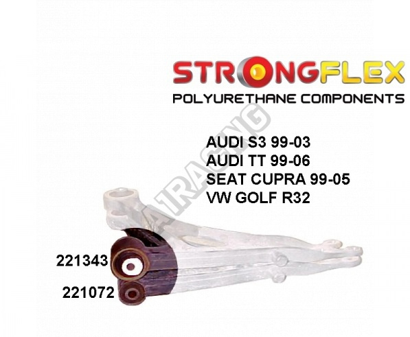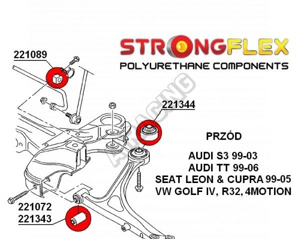 VW Golf IV 1997-2003 R32 StrongFlex (tvrdost 80ShA) kompletní sestava silentbloků na celé auto obsahuje :