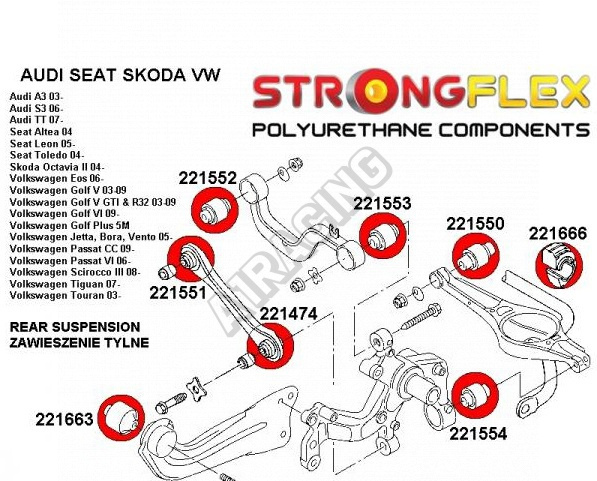 VW Golf VI 2008-2012 StrongFlex Sport sestava silentbloků jen pro zadní nápravu 16 ks obsahuje: