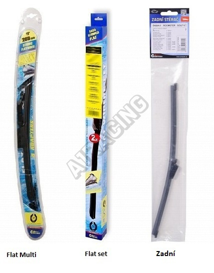 Stěrače FLAT SET (sada 2 ks na celé auto). Vysoce kvalitní pružný člen plochého stěrače zajišťuje stejnoměrný tlak grafitového břitu v celé jeho délce, což zamezuje rozmazávání nečistot a vytváření pruhů.
