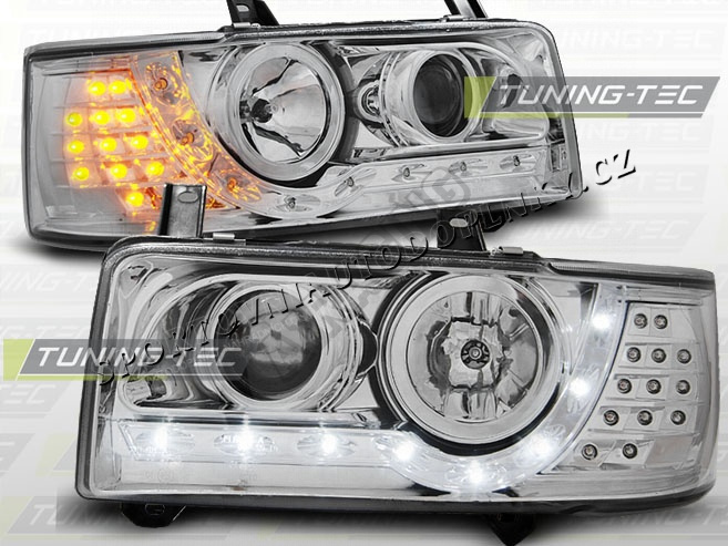 VW T4 1990-03 TRANSPORTER PŘEDNÍ ČÍRÁ SVĚTLA DAYLIGHT LED CHROME LED INDICATION
