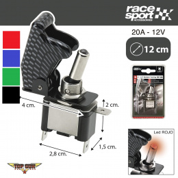 Osvětlený vypínač s krytem na pantu (LED dioda v páčce spínače), napájení 12V.