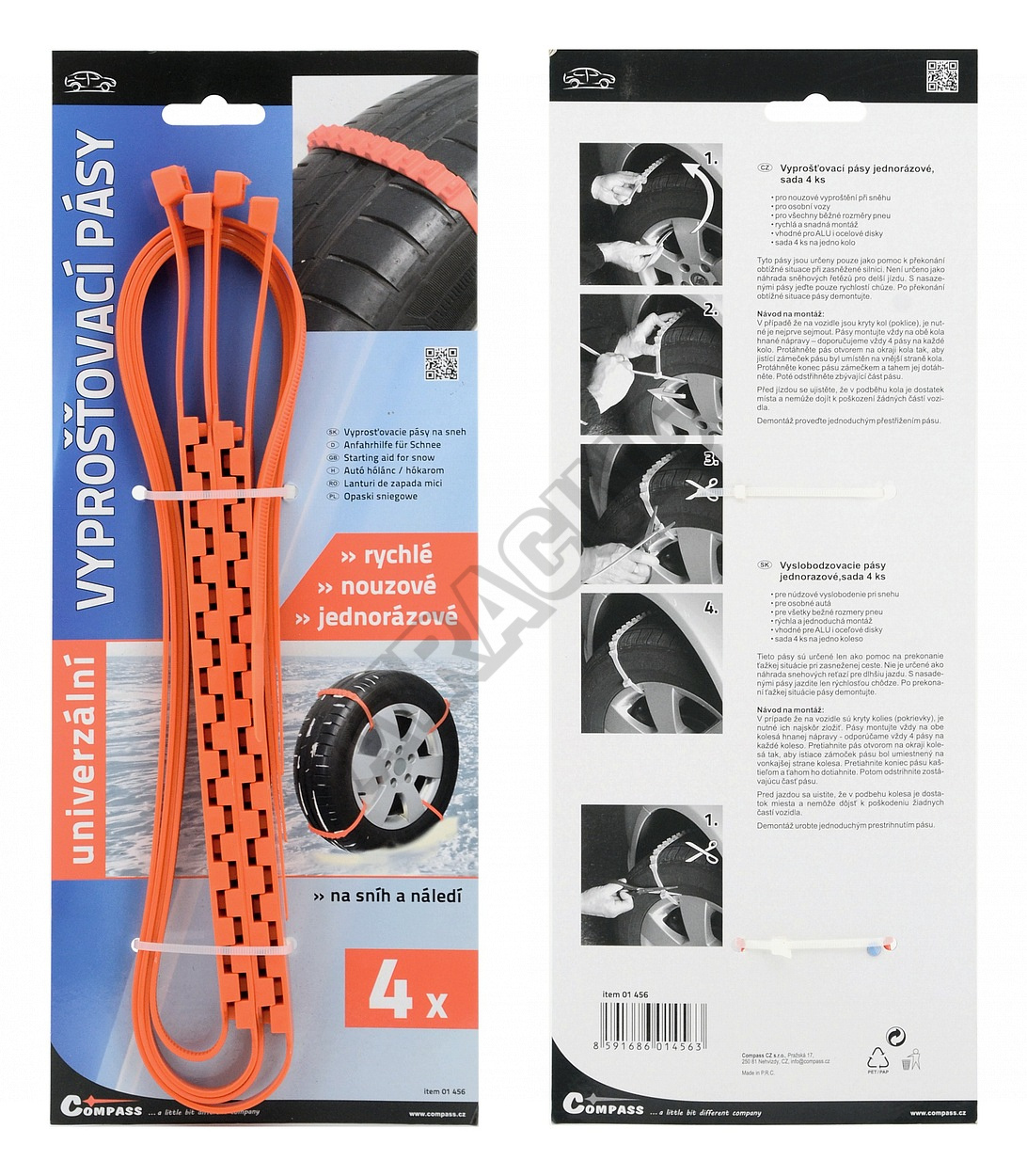 Jednorázové vyprošťovací pásy pro nouzové vyproštění vozidla při sněhu. Vhodné pro osobní vozy, pro všechny běžné rozměry pneumatik. Balení obsahuje 4 ks jednorázových vyprošťovacích pásů určených pro jedno kolo.