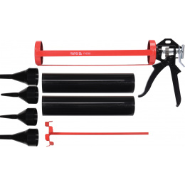 Pryžový píst je vyztužený kovovými destičkami. Sada obsahuje míchadlo pro přípravu hmot a dva hroty pro aplikaci.