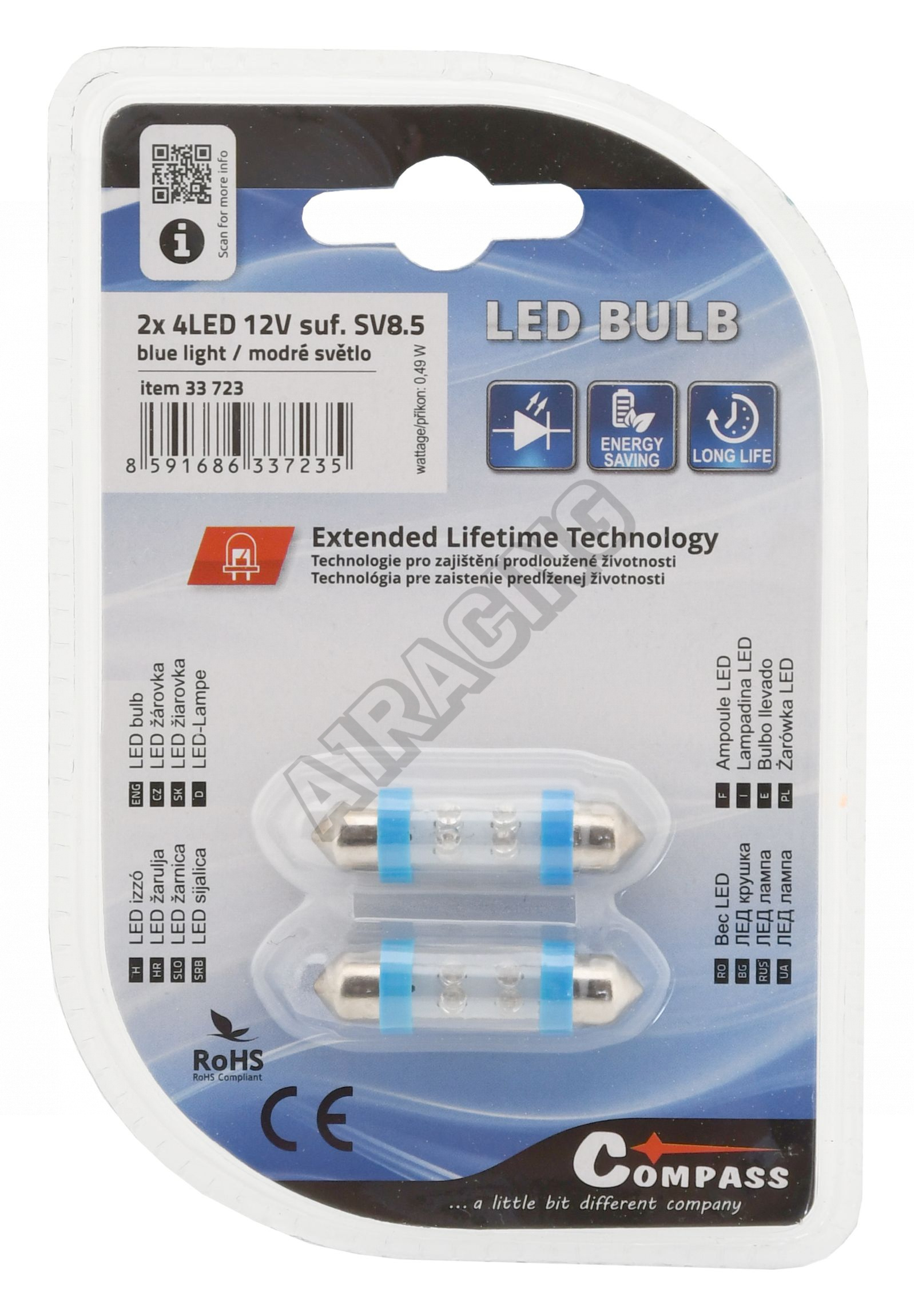 Žárovka 4LED 12V suf. SV8.5 38mm modrá 2ks121 Kč