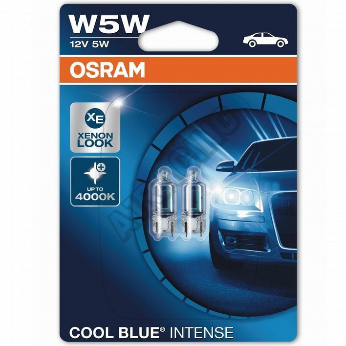 Osram Cool Blue Intense 2825HCBI-02B W5W W2,1x9,5d 12V 5W jsou velmi kvalitní autožárovky s namodralým světlem xenonového efektu od firmy Osram. Vydávají vysoce kontrastní světlo podobné přirozenému dennímu světlu, příjemnější pro oči než světlo z konvenčních světlometů. Namodralé světlo má teplotu chromatičnosti až 4000 K. Patice: W2,1x9,5d