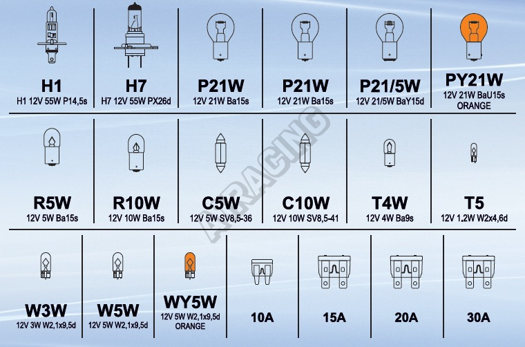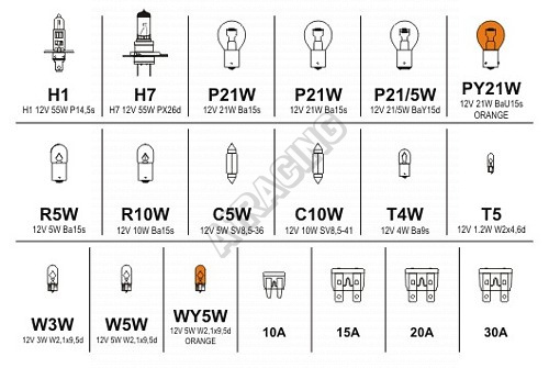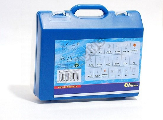 Uzavíratelný kufřík se sadou náhradních žárovek 12V a pojistek, homologace E.